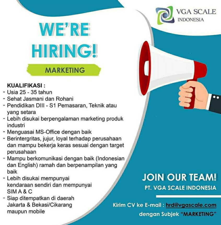 Tambnas Loker - PT VGA Scale Indonesia merupakan perusahaan yang bergerak di bidang distributor timbangan. Saat ini PT VGA Scale Indonesia sedang membutuhkan karyawan yang bermotivasi tinggi dalam bekerja dan untuk posisi yang dibutuhkan ialah sebagai berikut